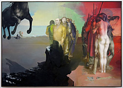 Der Maler Arno Rink ist, so muß man es sagen, das Bindeglied zwischen der altern und der neuen Leipziger Schule. Mit seiner Arbeit hat er wie keiner vor ihm die neue und junge Künstlergeneration der HGB beeinflußt, das mit seiner ihm eigenen modernen Bildersprache. In seinen monumentalen Gemälden treten dem Betrachter fast lebensgroße Figurengruppen in surrrealistisch-visionären Szenen entgegen – die an bekannte Bild- und Archetypen erinnern, die in einer rätselhaften Schönheit. Häufig hat er die Figuren einer antiken Mythologie oder christlichen Ikonografie entliehen.